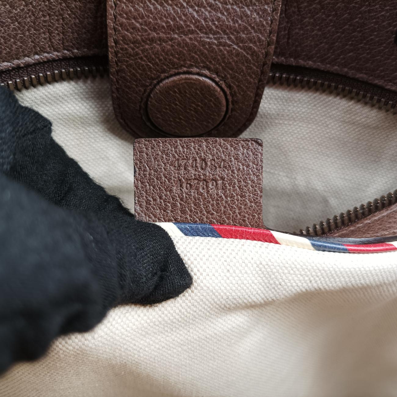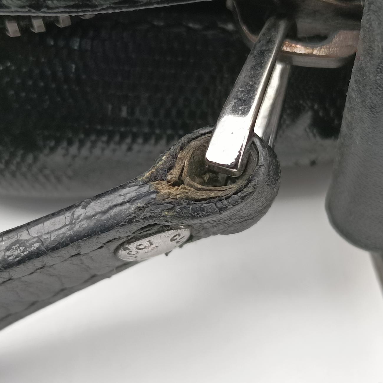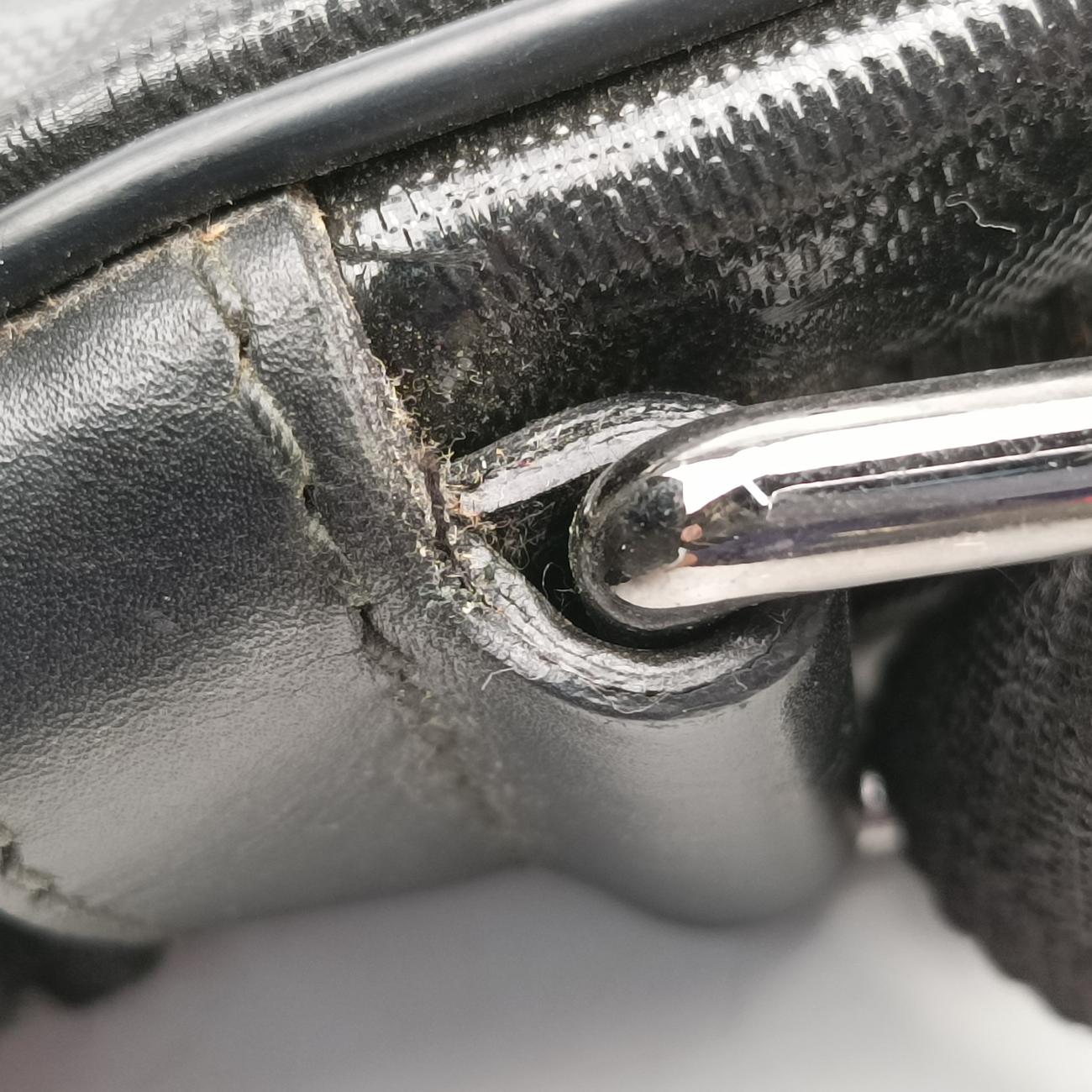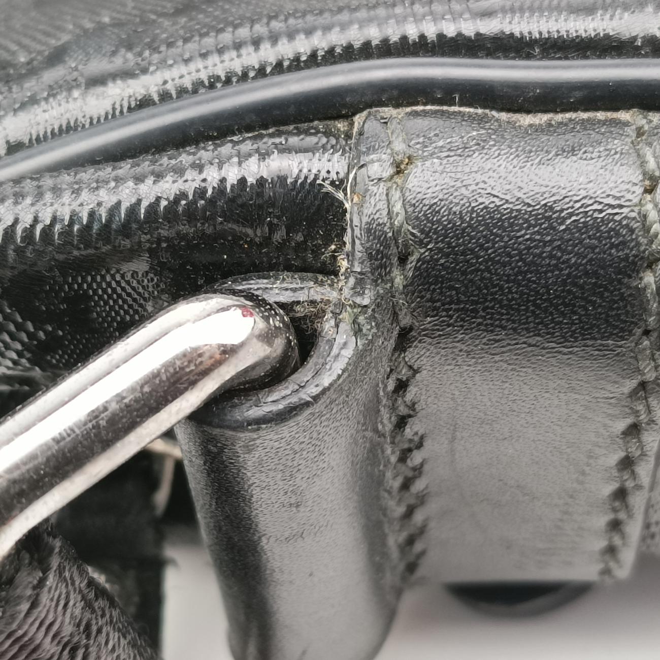 全体の中度使用跡、辺角の軽度摩耗、四角補花跡クラッド補色跡、金属の軽度摩耗、手提げ接続部の油辺の軽度な亀裂、肩ベルトの油辺の中度亀裂、バッグの口側のポケットが開線している、内裏中等度起毛;