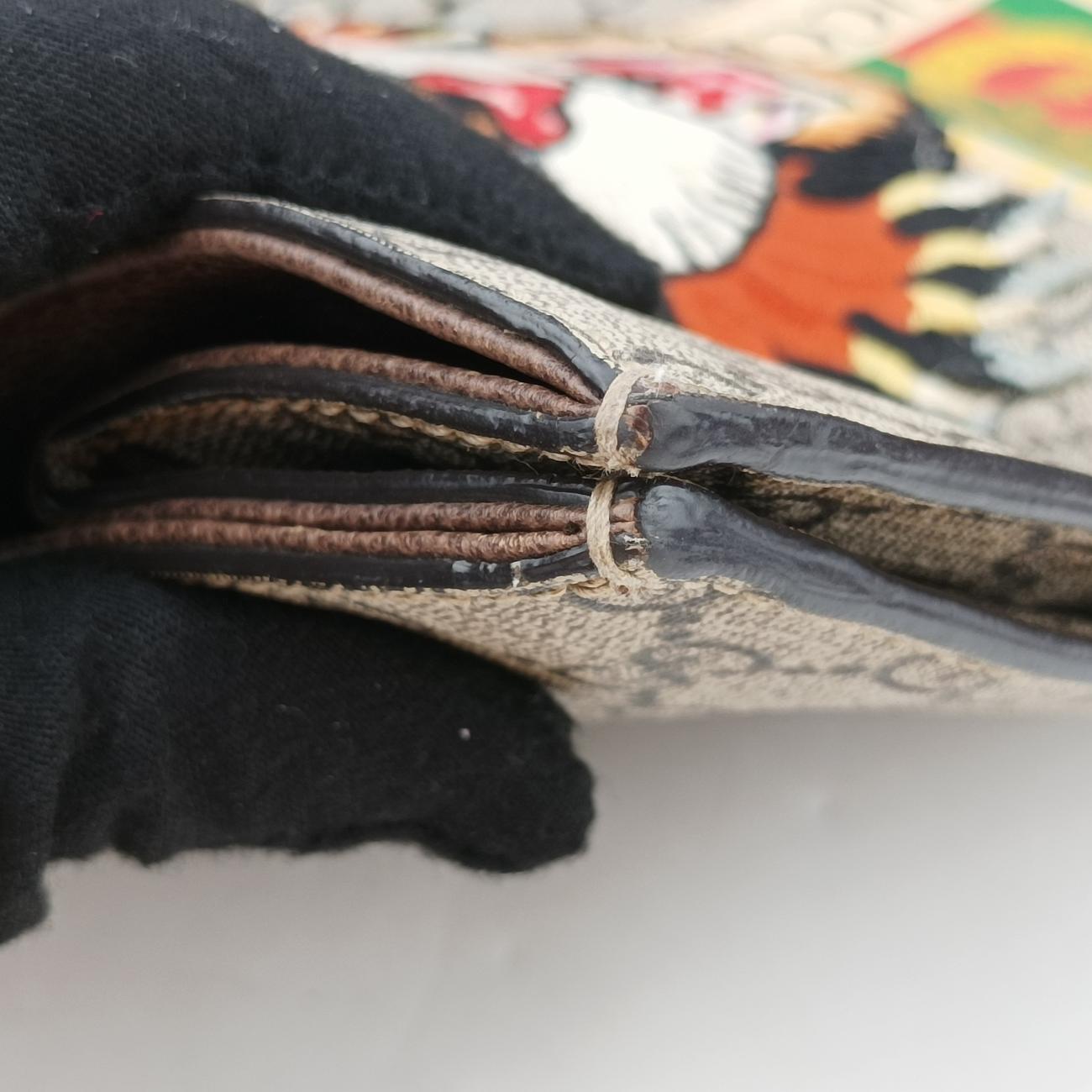 全体の中度使用跡、内側の中等度の汚れ、毛羽立ち、包帯正面の軽い汚れ、内包口の補色跡、内側の金は磨耗している、包口油辺の軽度の亀裂、手提げ油辺の中等度圧痕、摩耗;